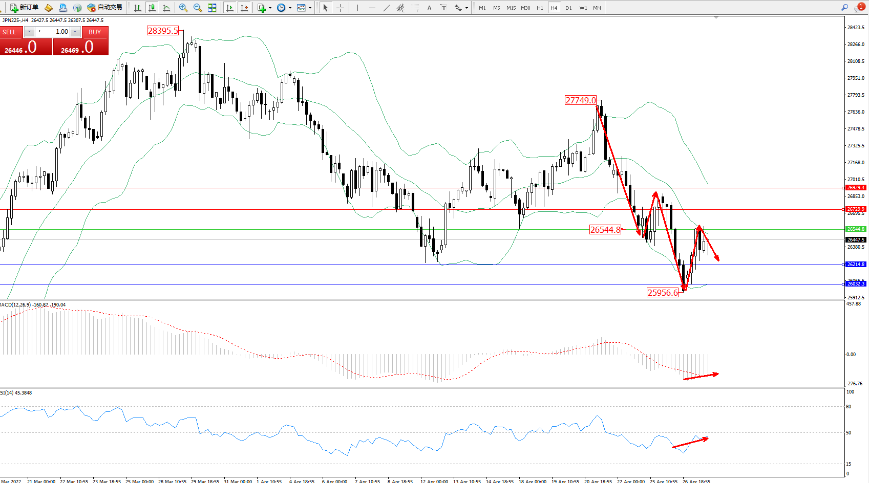 日经指数JPN225——4小时K线图显示: