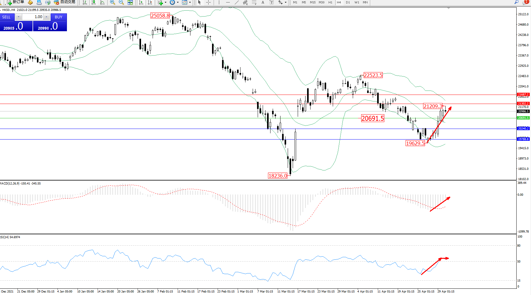 恒指HK50 ——4小时K线图显示: