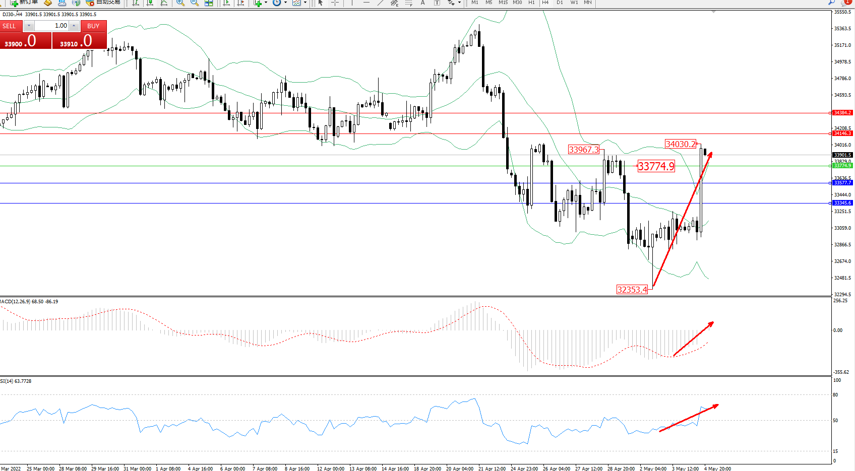道琼斯指数DJ30——4小时K线图显示: