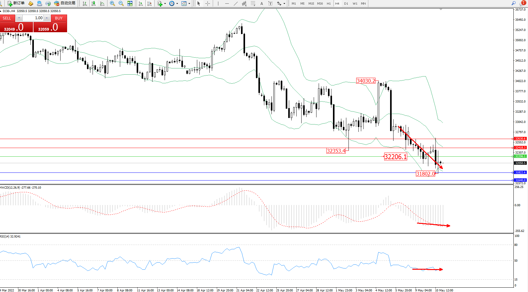 道琼斯指数DJ30——4小时K线图显示: