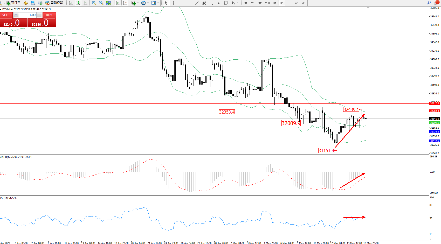 道琼斯指数DJ30——4小时K线图显示: