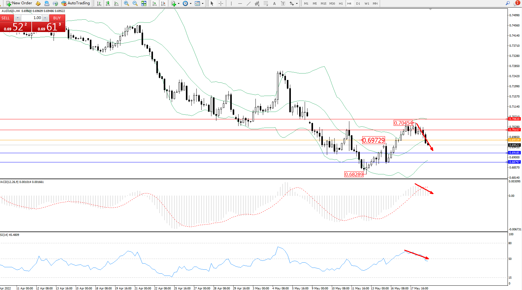 交易策略:0.69729下方看跌,目标0.69185、0.68797