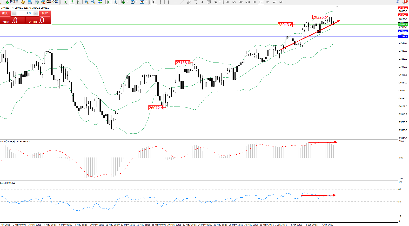 日经指数JPN225——4小时K线图显示: