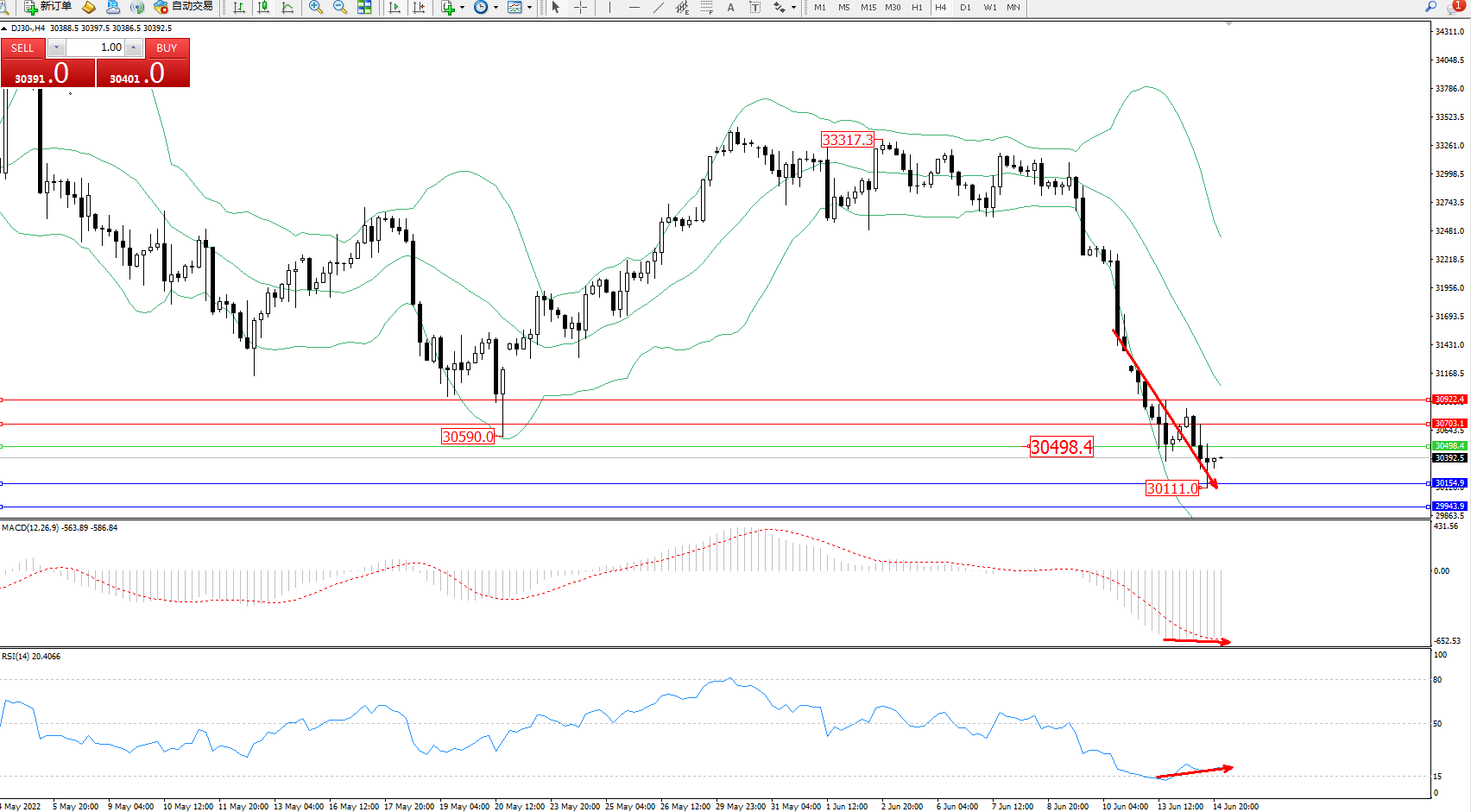 道琼斯指数DJ30——4小时K线图显示: