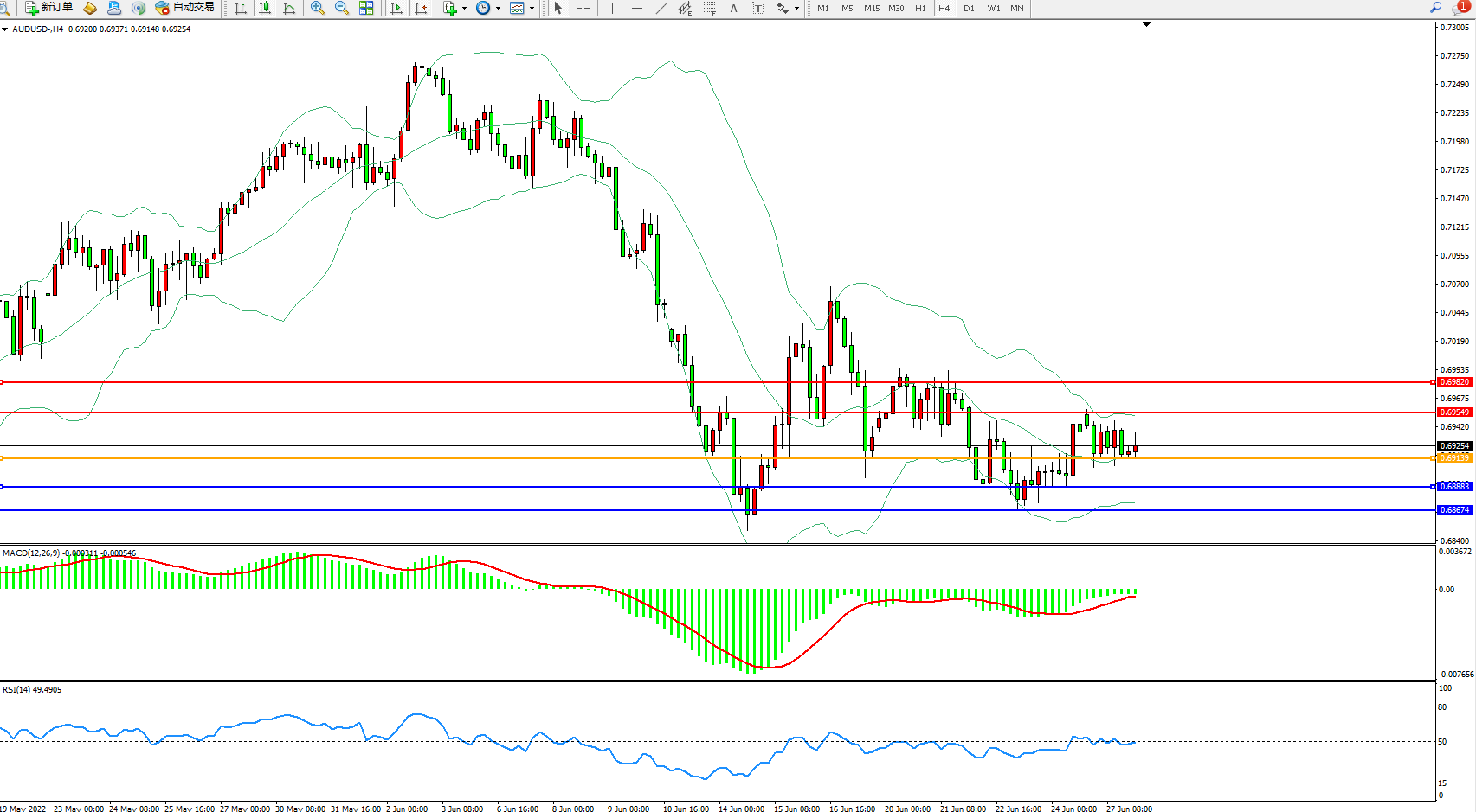 交易策略:0.69139上方看涨,目标0.69549、0.69820