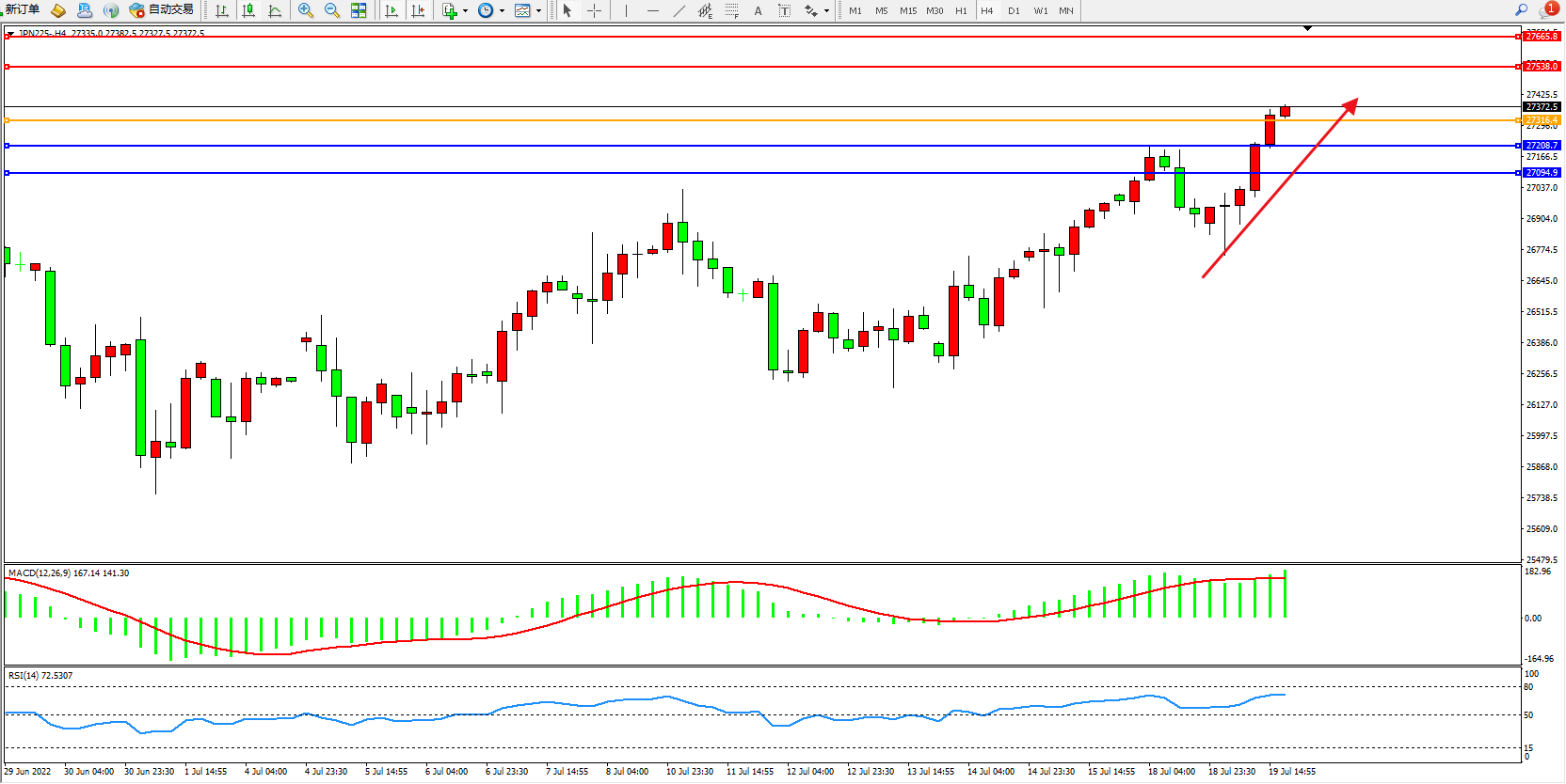 日经指数JPN225——4小时K线图显示: