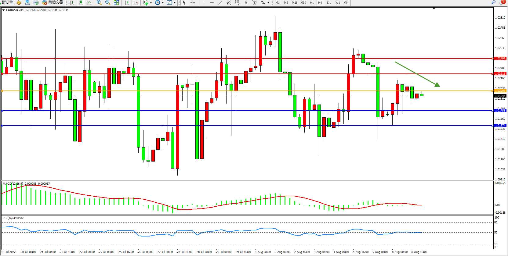 欧元美元EURUSD—4小时K线图显示: