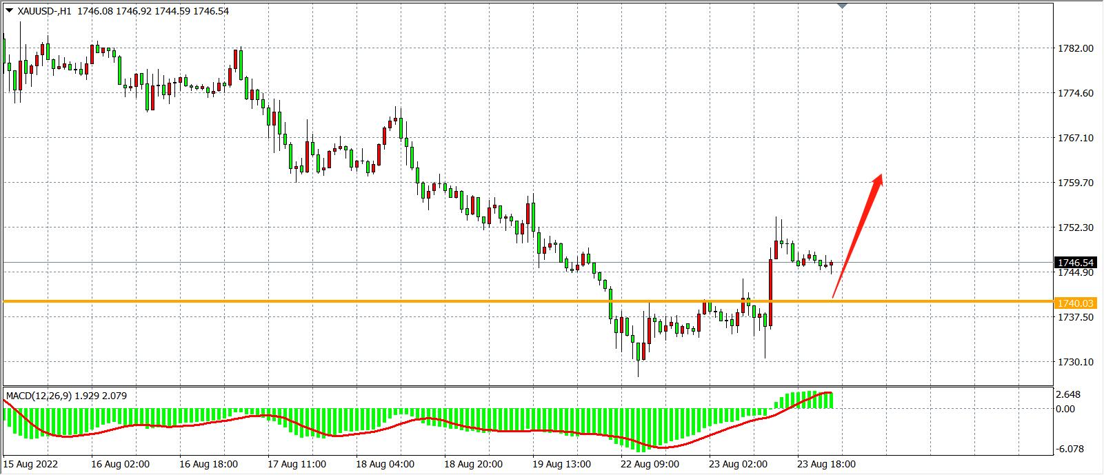 1小时图看,金价强势反弹上破关键阻力1740美元,短线形成底部形态,日内在该位之上可继续看涨为主,MACD于零轴之上开始放量,显示行情有进一步走高的动能,日内在1740之下看反弹,上方目标1760-1780
