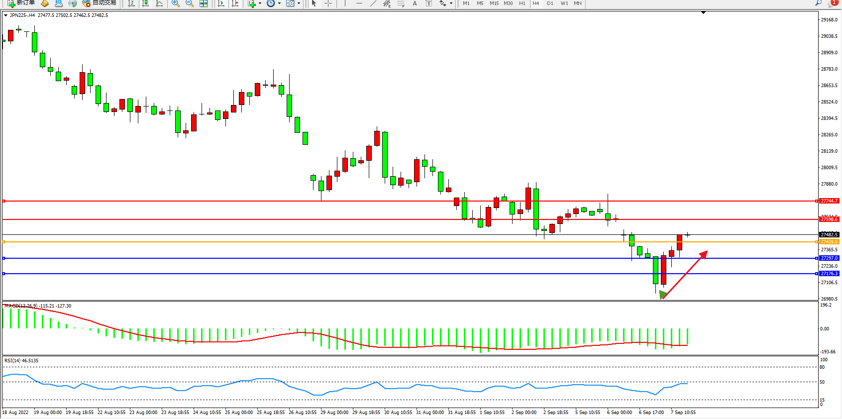 日经指数JPN225——4小时K线图显示: