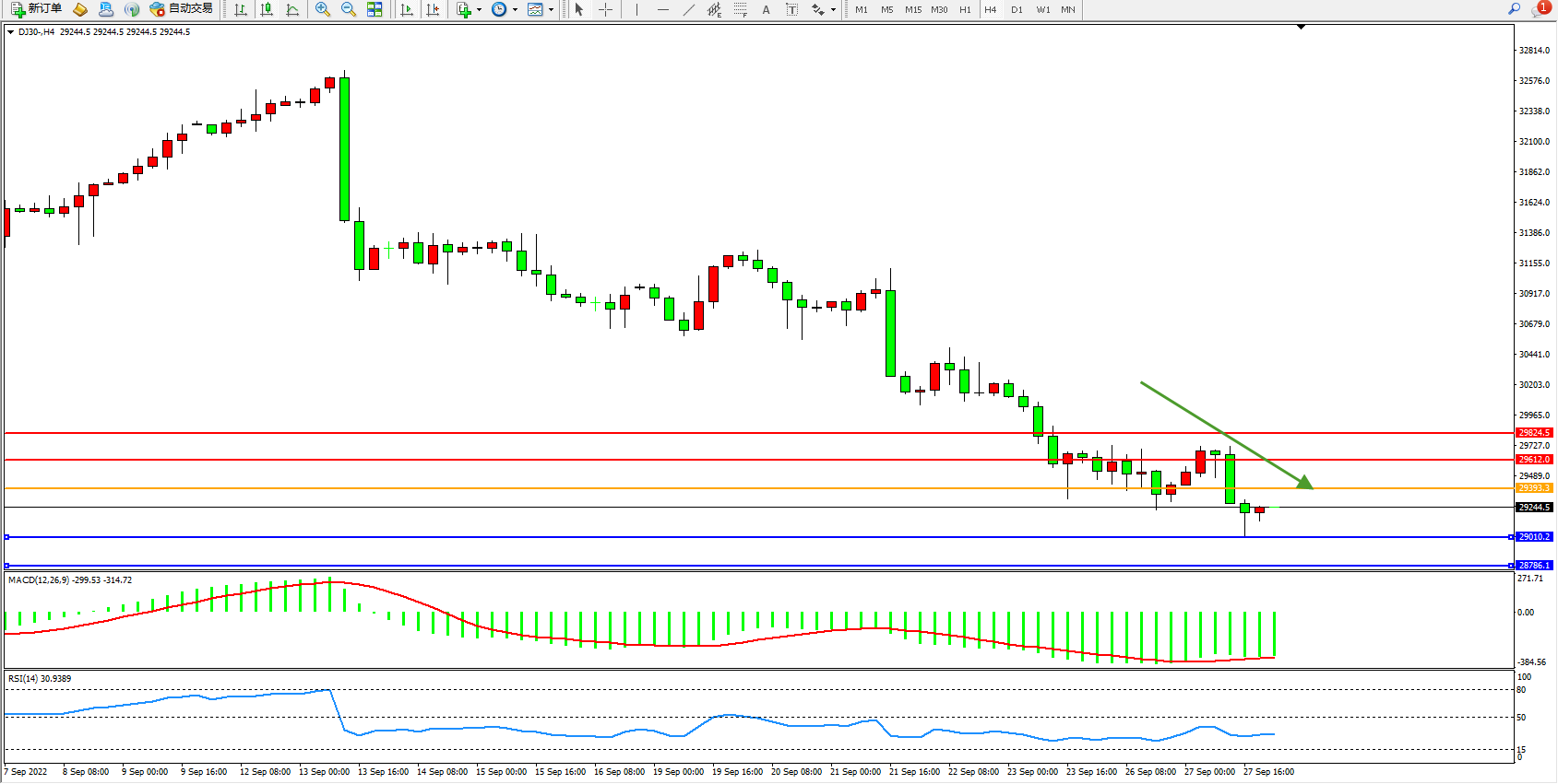 道琼斯指数DJ30——4小时K线图显示: