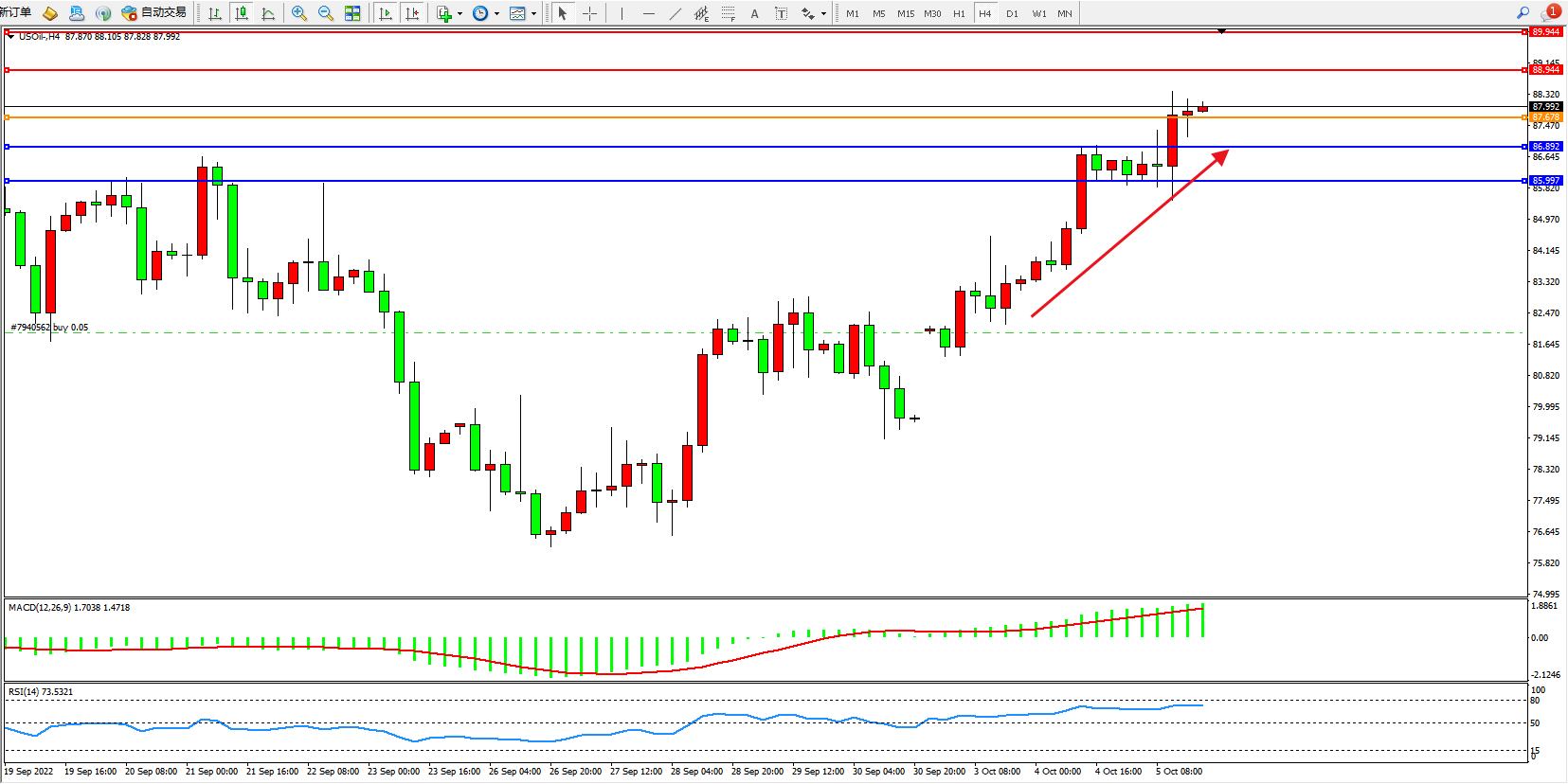 交易策略:87.678上方看涨,目标88.944、89.944