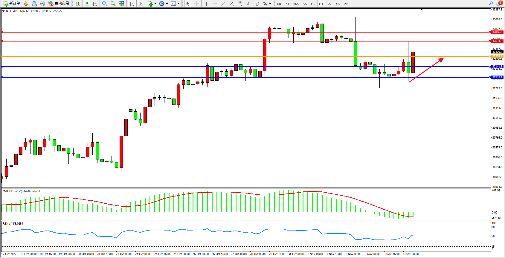 道琼斯指数DJ30——4小时K线图显示:
