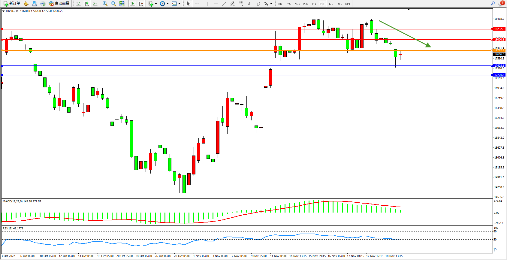 香港恒生指数11月21日(周一)收盘下跌336.63点,跌幅1.87%,报17655.91点;港股全天低位震荡,恒生科技指数盘初一度跌近5%,恒指、国指分别跌1.87%和2.02%。盘面上,大型科技股全天表现低迷拖累大市走低,京东跌5.23%,受疫情影响的酒店餐饮股、旅游景区股、航空股等全线下挫;南下资金全日净流入63.82亿港元,大市成交额为1102亿港元。