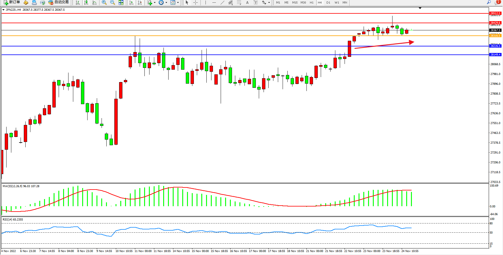 日经指数JPN225——4小时K线图显示: