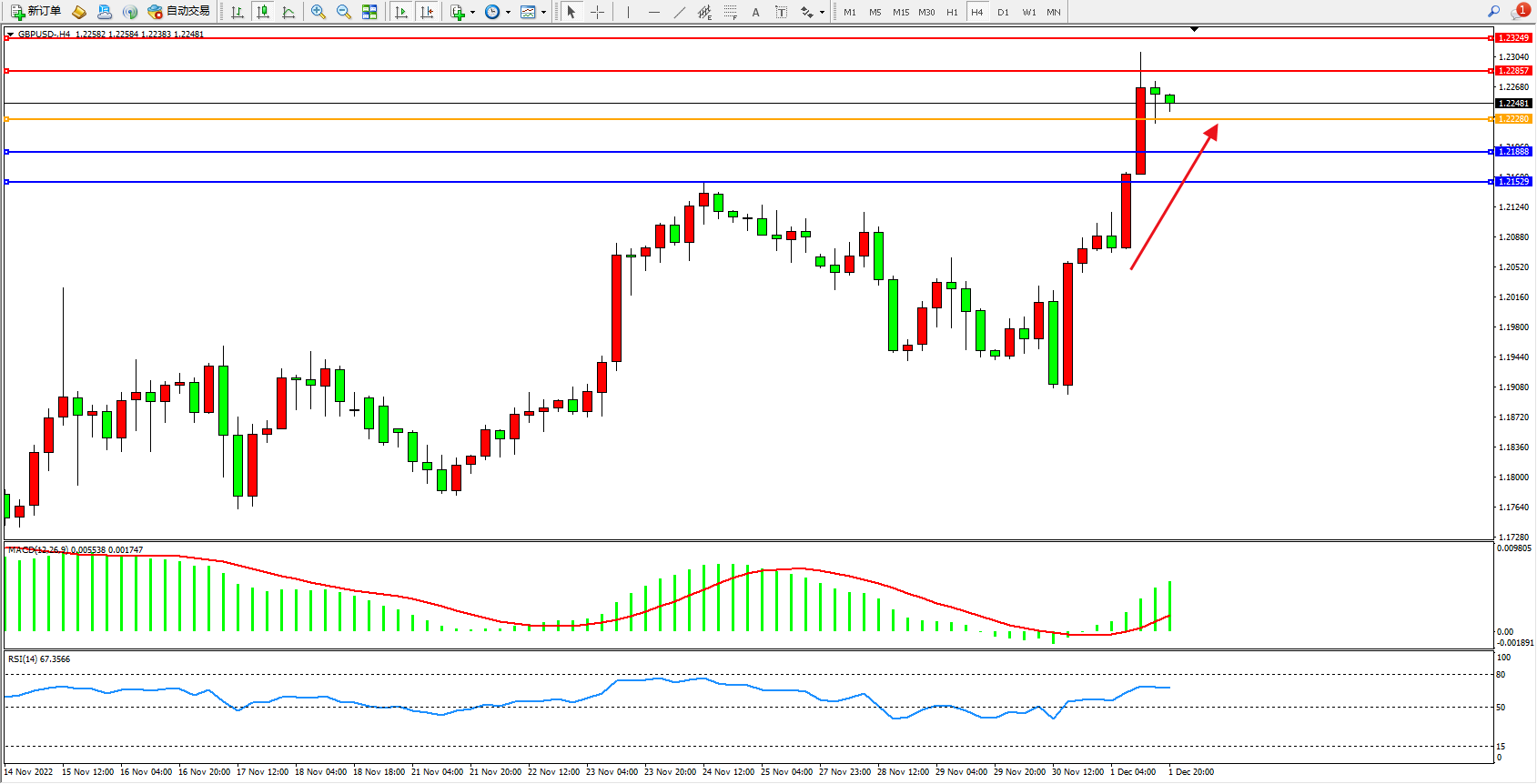 交易策略:1.22280上方看涨,目标1.22857、1.23249