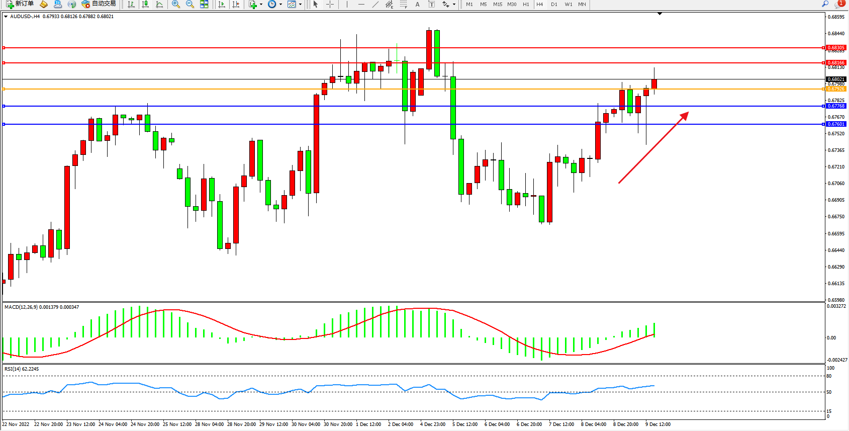 交易策略:0.67926上方看涨,目标0.68166、0.68305