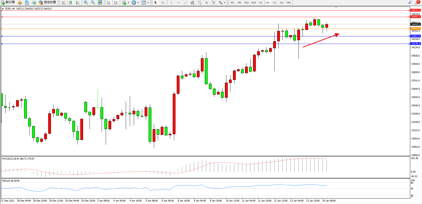 道琼斯指数DJ30——4小时K线图显示: