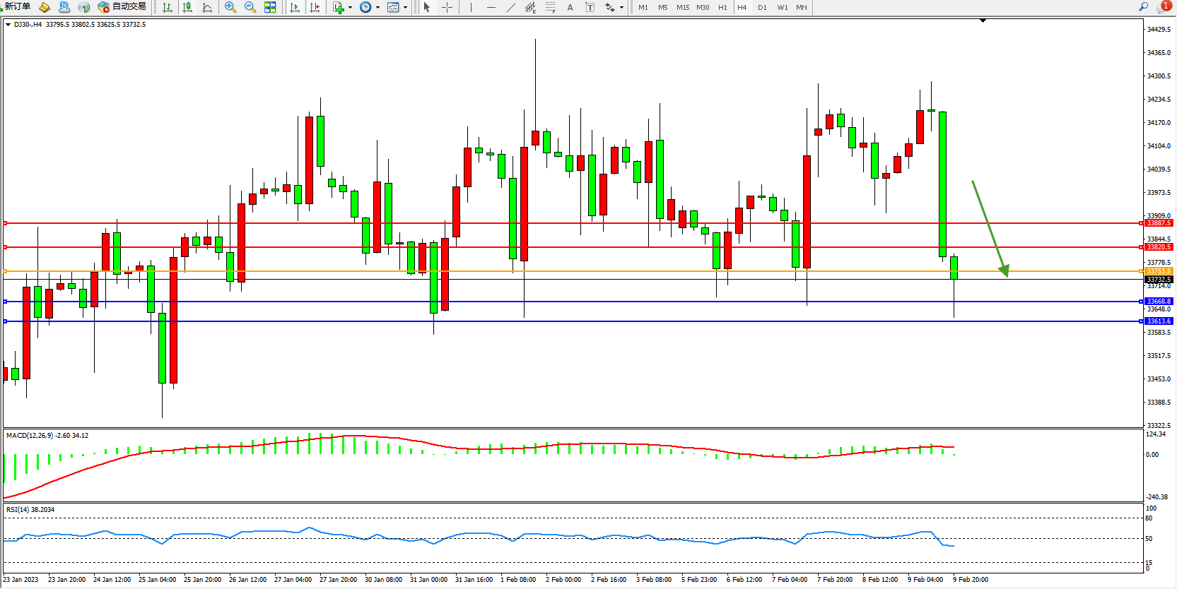 交易策略:33753下方看跌,目标33668、33613