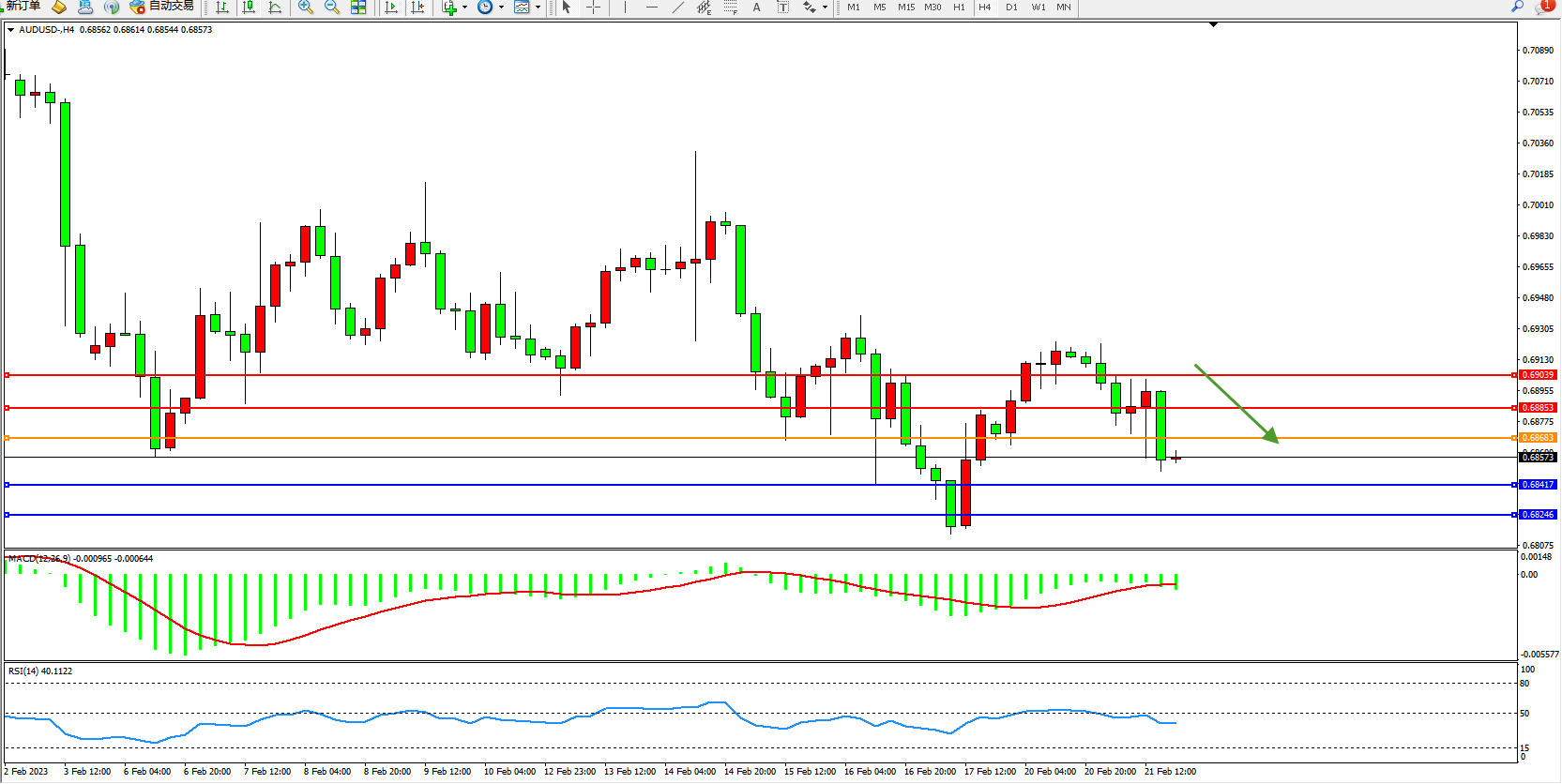 交易策略:0.68683下方看跌,目标0.68417、0.68246