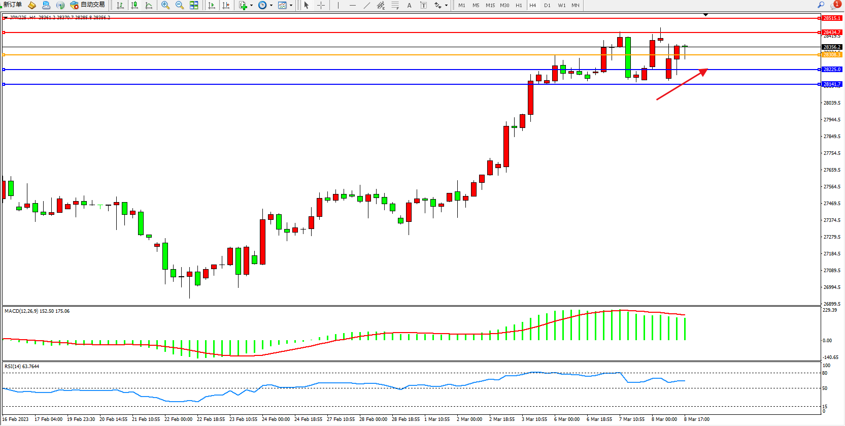 日经指数JPN225——4小时K线图显示: