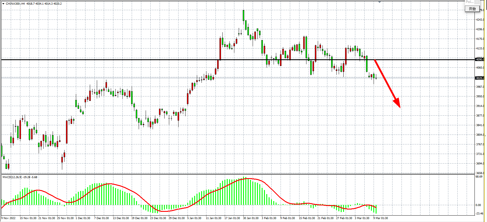 4小时图看,沪深300继续回落在4030之下运行,同时MACD于零轴之下再度放量,趋势偏向下行,阻力关注4090,在4090之下继续以看空为主,下方目标4000-3920附近。
