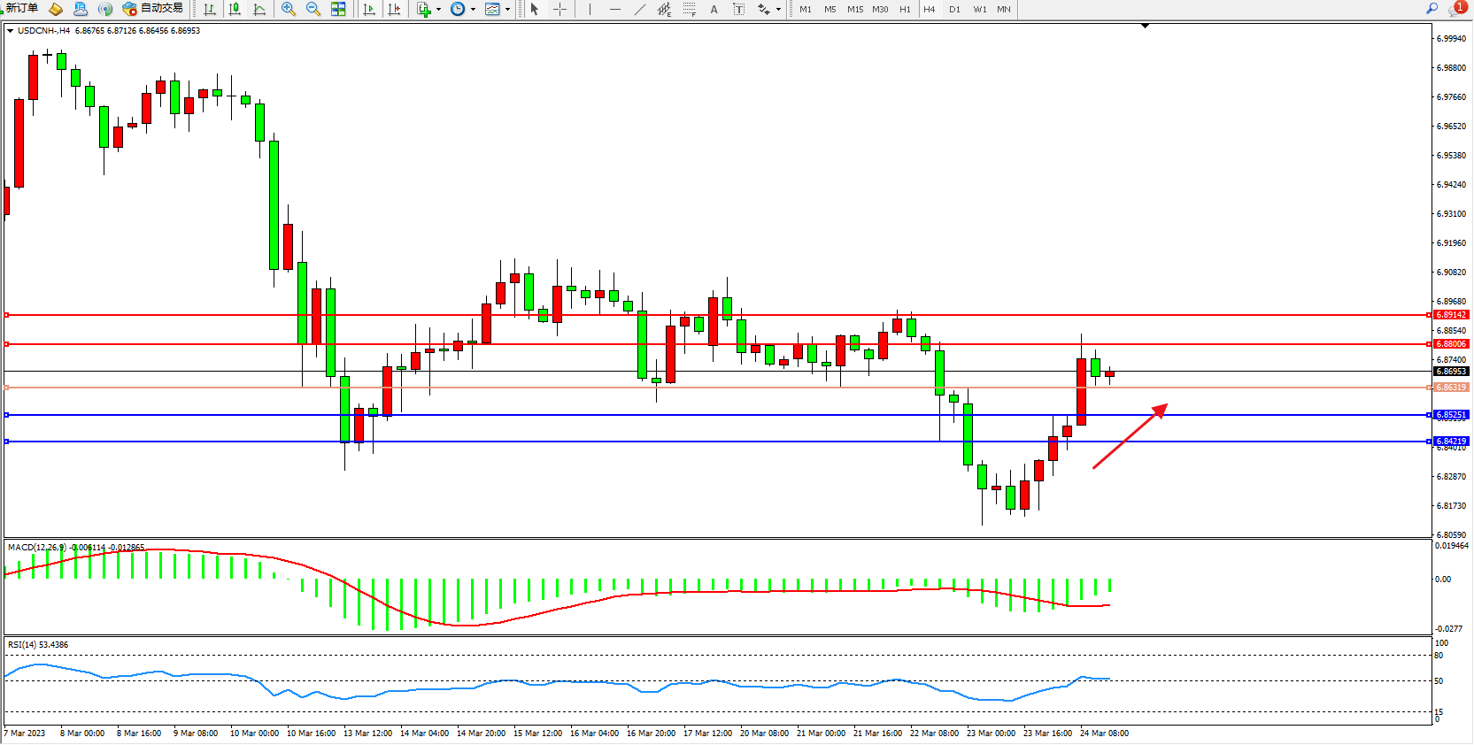 交易策略:6.86319上方看涨,目标6.88006  6.89142