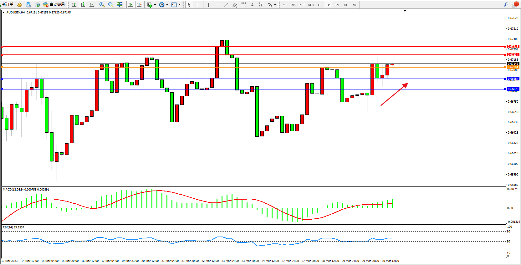 交易策略:0.67104上方看涨,目标0.67234 0.67319