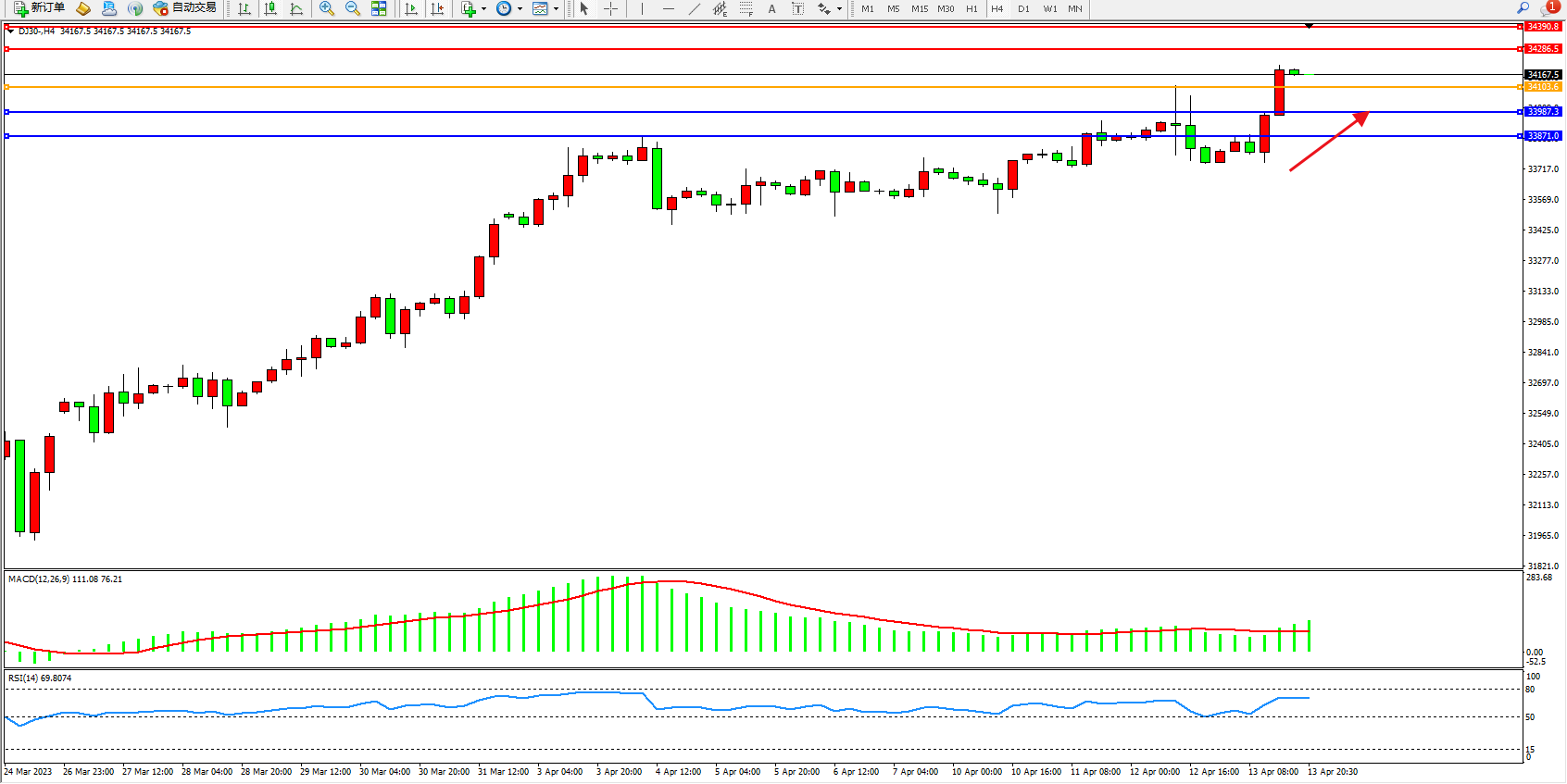 道琼斯指数DJ30——4小时K线图显示: