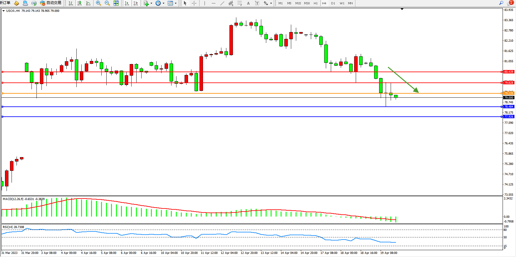 原油维持79.000附近震荡,美国至4月14日当周EIA原油库存 -458.1万桶,预期-108.8万桶,前值59.7万桶。美国至4月14日当周EIA俄克拉荷马州库欣原油库存 -108.8万桶,前值-40.9万桶。