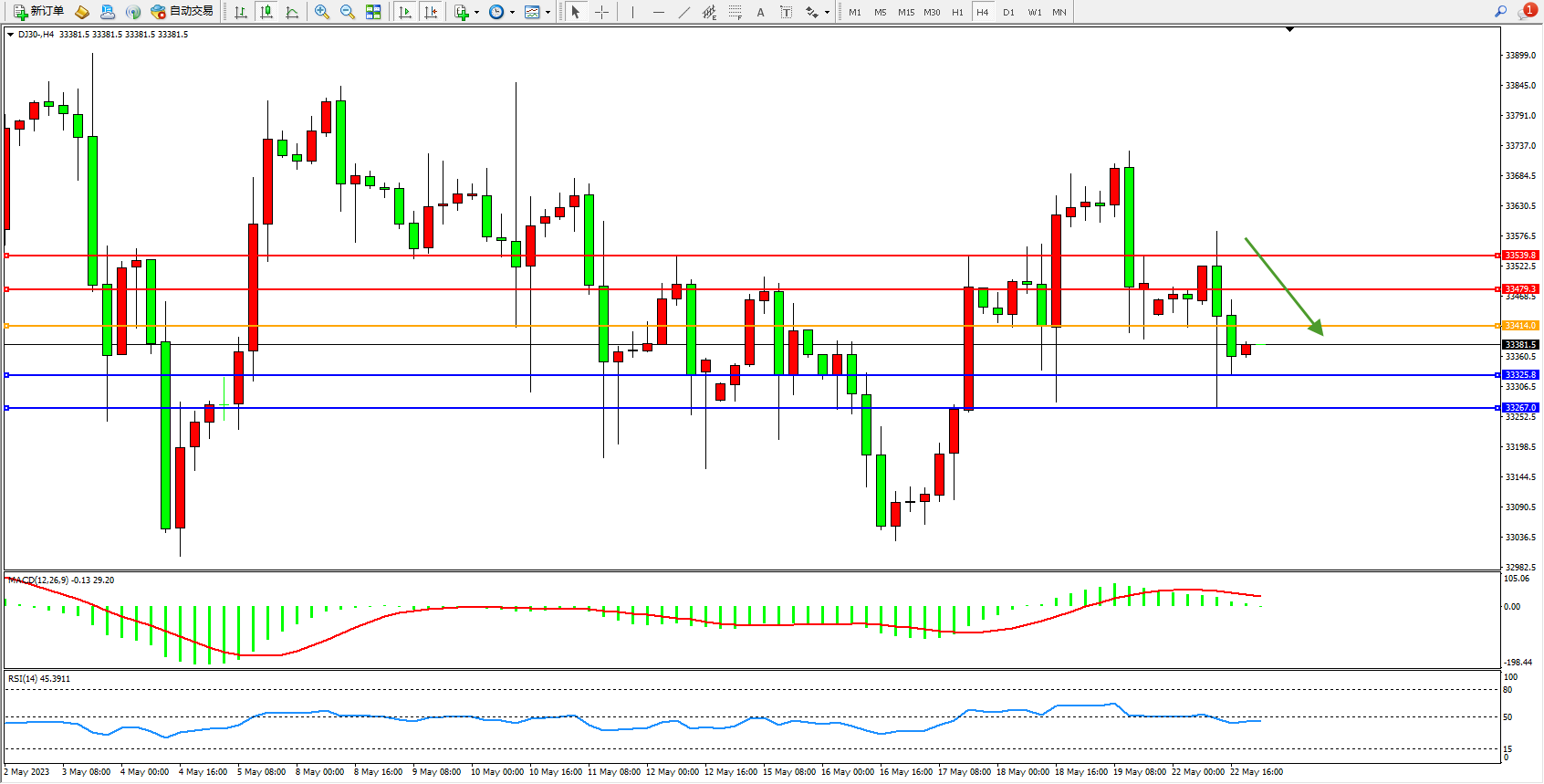 道琼斯指数DJ30——4小时K线图显示: