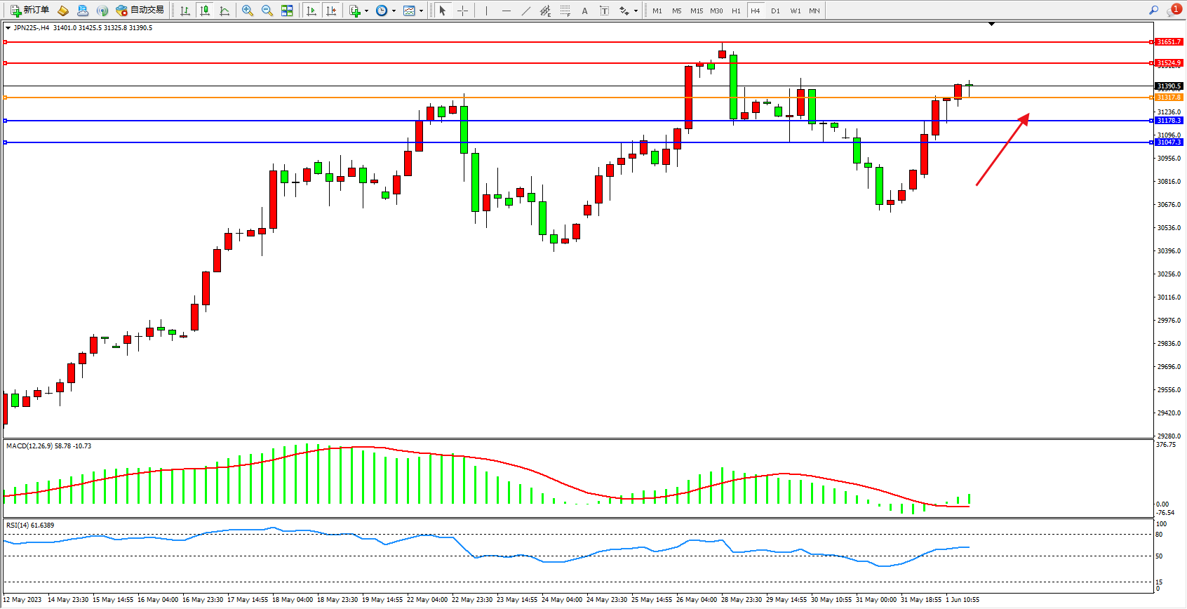 日经指数JPN225——4小时K线图显示: