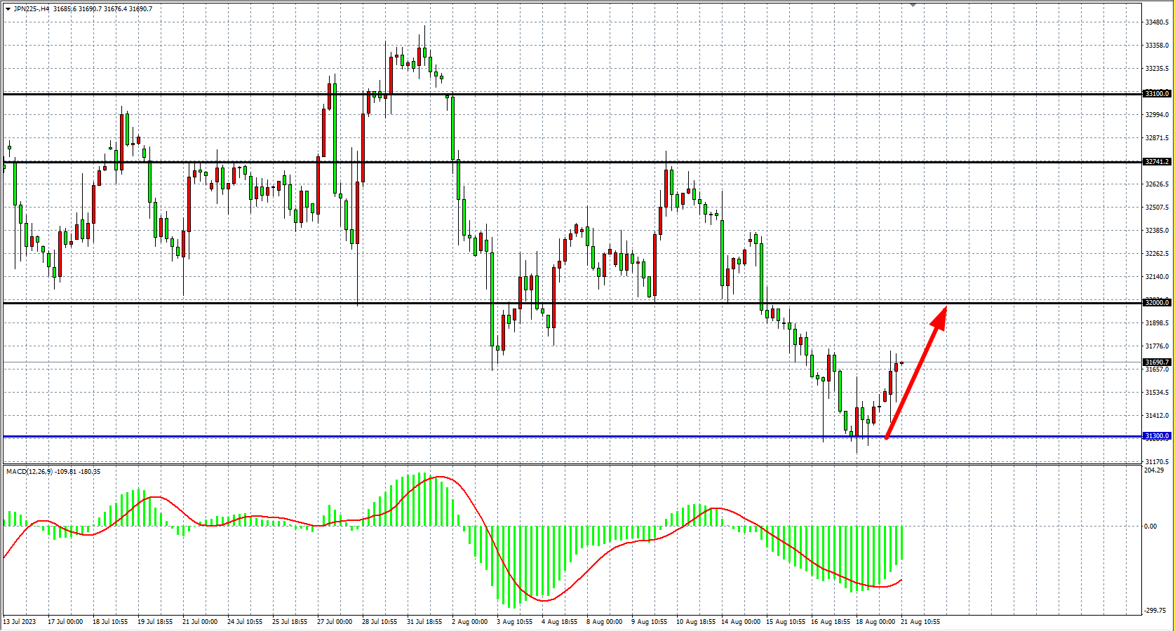 4小时图看,日经指数在31300附近受支撑明显反弹,MACD量能在零轴下缩量,,阻力关注32000附近。