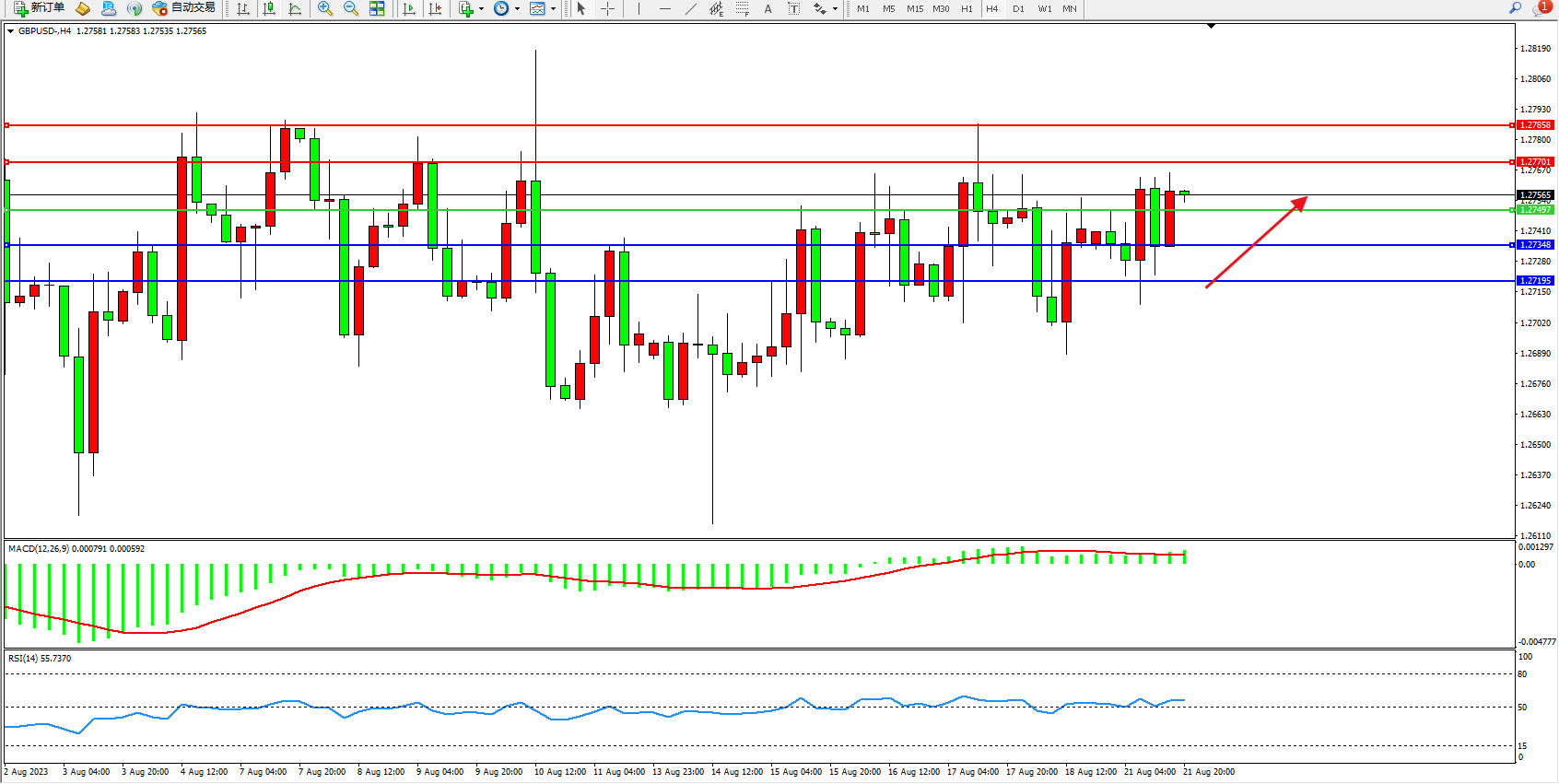 4小时图看:高位短期震荡,市场看涨情绪依旧,短期有继续向上移动迹象,MACD指标处于0轴线上側弱势整理,RSI指标处于50均衡线上側弱势徘徊;