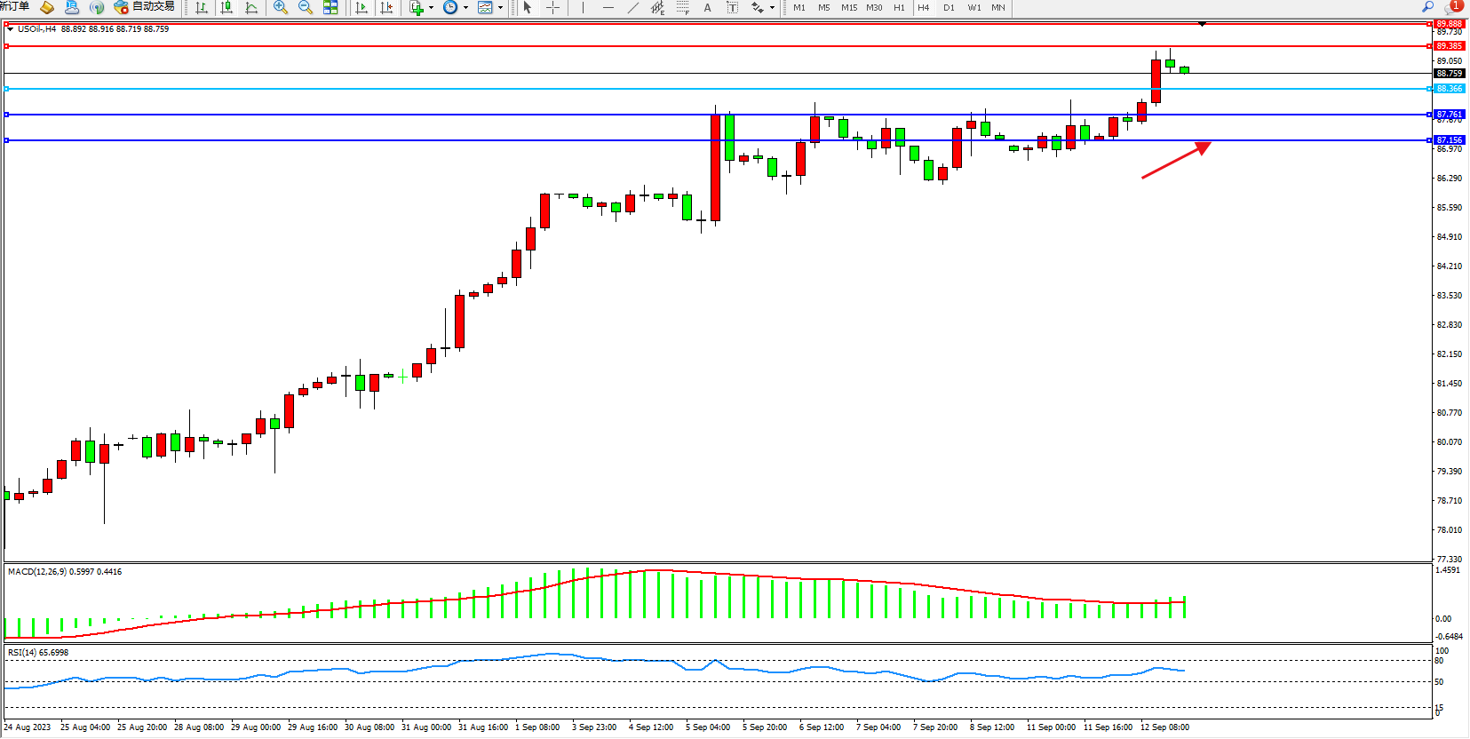 4小时图看:高位多头动力维持震荡上移,短期看涨情绪依旧,市场多头不断拉升中,MACD指标处于多头区域维持整理,RSI指标处于多头区域维持震荡;