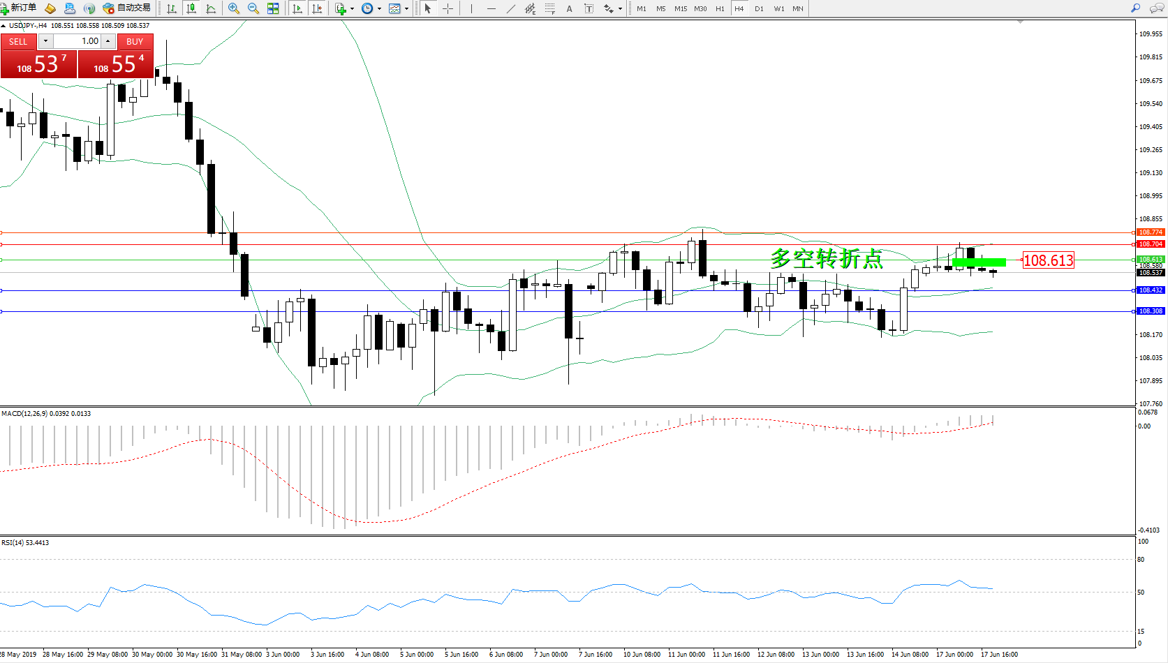 交易策略:108.613下方看跌,目标108.432108.308