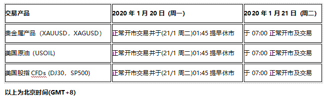 部分交易产品的交易时间将因假期提早或全日休市