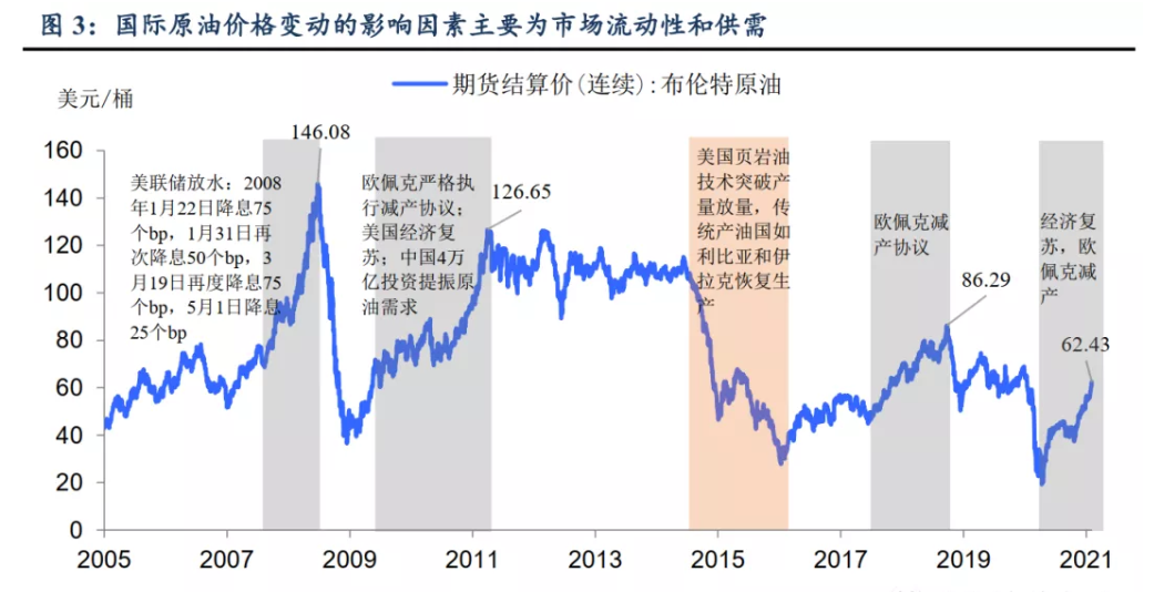 从图中可看出,2009-2011年源于欧佩克严格执行减产协议、美国经济复苏、中国4万亿刺激带动原油需求,布伦特油价在2009年5月突破60美元/桶,随后两年又翻了一倍,最高上涨至127美元/桶。