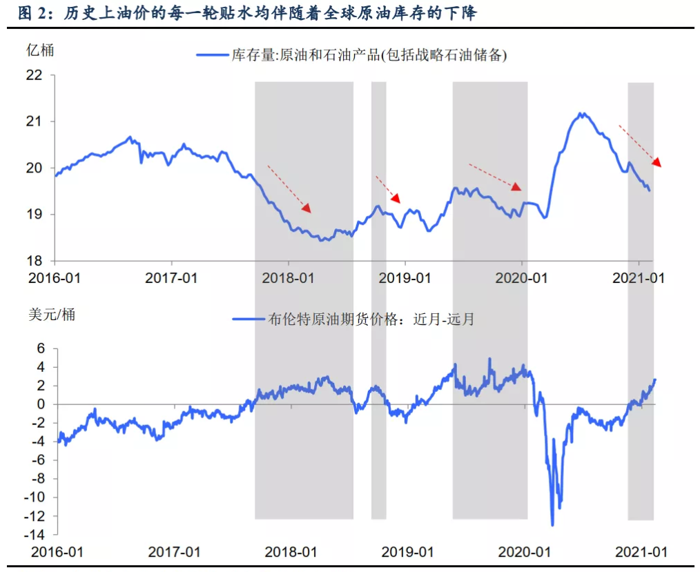 从供给端来看,沙特身体力行,率先垂范,领导着欧佩克+坚定减产的立场,1月欧佩克+的原油减产执行率为103%,且沙特承诺在2月和3月将额外再减产100万桶/日。此外,原油期货市场也已出现贴水迹象,即原油现货价格高于期货,而历史上贴水的出现均伴随库存的明显下降,这是因为此时原油厂商囤积库存不如当前变卖划算,从而加大去库存力度,导致原油供需进一步收紧。