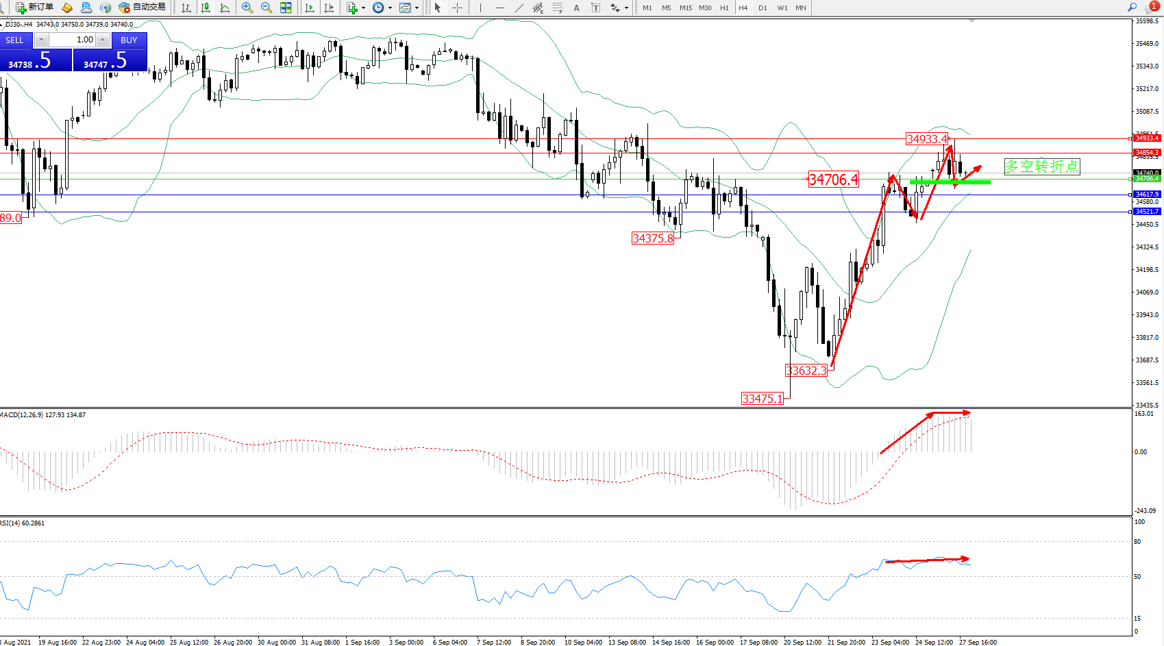 道琼斯指数DJ30——4小时K线图显示: