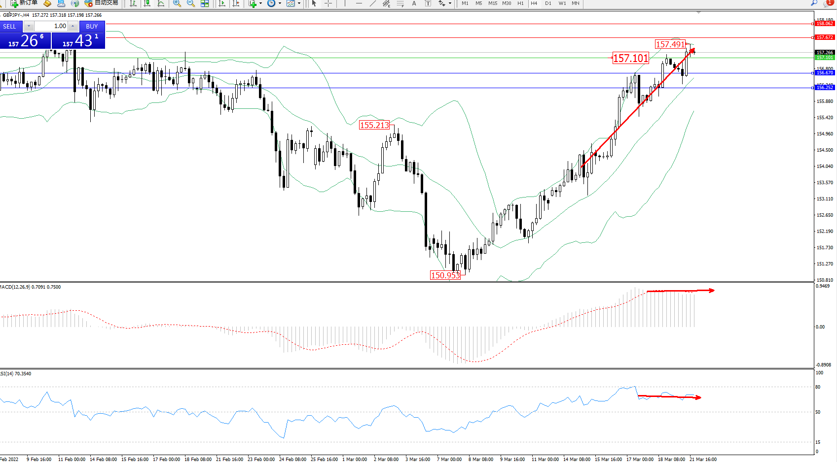 备选策略:157.101下方看跌,目标156.670、156.252