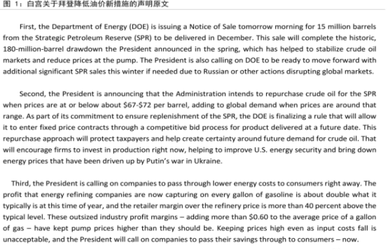 从本次宣布的三条措施具体来看:1)12月投放的1500万桶是原计划中未完成部分,实质上并无额外增量,因此短期影响不大。但需要关注后续是否会额外追加投放。能源部表示将于下个月决定明年1月的储备库存投放量。如果美国逐月调整战略库存投放量,将与欧佩克逐月调整产量配额行为形成对冲效应,一定程度削弱欧佩克减产对油价支撑力度。但由于目前美国战略库存已经处于极低水平,难以长期持续投放,中期效果有限。2)战略库存回购计划是对此前5月初步拟定回购机制的补充完善。本次确定的67-72美元/桶的目标价格区间,将在未来油价跌至此区间水平时提供较强托底支撑。目前通过竞价确定未来购买意向,但实际交付时间在2024年到2025年之后,因此对短期原油产量和需求提振效果有限。3)呼吁石油公司自觉降低利润水平和终端销售价格,较难形成自发响应。后续需要关注拜登近期重点推动的禁止汽柴油出口政策是否能够落实,中期选举前实施概率不大。未来如果实施将利空美国国内成品油价格,利多国际成品油价格;届时需要关注中国是否会增加成品油出口填补美国出口减量。从油价反应来看,由于上周拜登已经预告本周将宣布新措施,因此市场有一定领先预期。周二具体方案宣布前原油价格短期回落,周三正式宣布后反而小幅回升,可能源于对新措施缺乏实质内容的评估。总体而言,仅就以上三条措施对短期油价情绪和供需影响不大,但需要关注未来更多措施出台可能性和届时对油价额外影响。