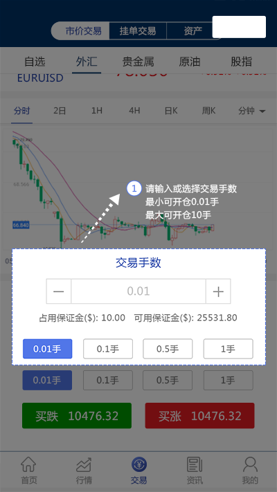 1.进入市价交易界面,输入或选择交易手数(最小可开仓0.01手,最大可开仓10手)